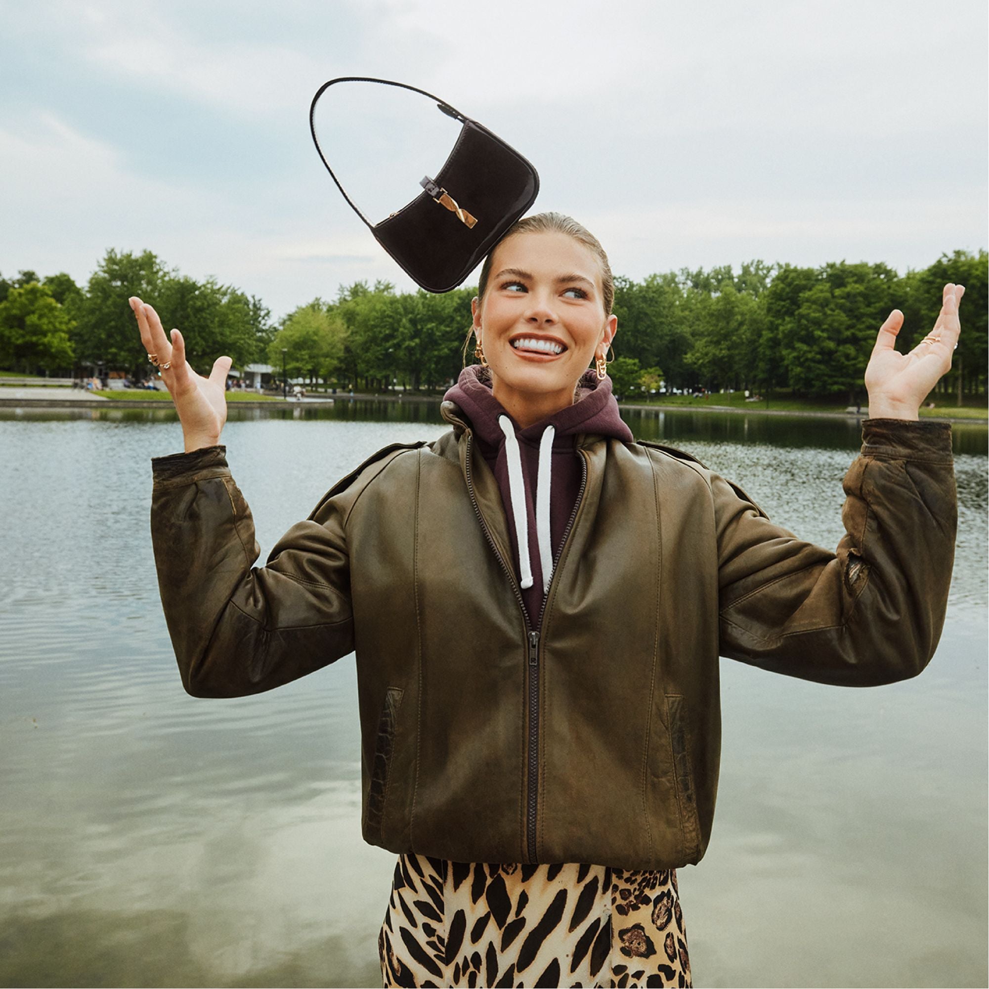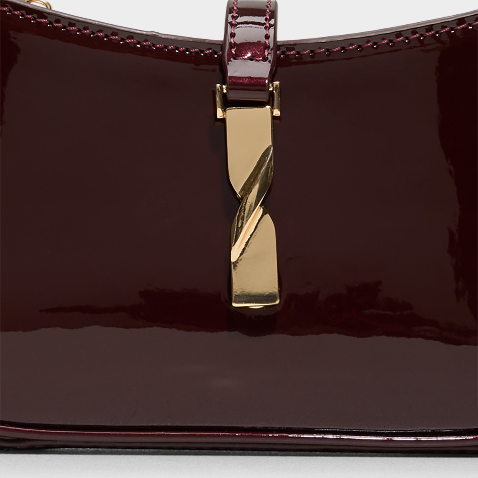 High-gloss espresso-dark patent leather coats a compact shoulder bag. delivering a ’90s silhouette with sculpted golden twist bars that snap magnetically shut over a clean. confident frame for city nights and rooftop chic. Carry it with satin slips for rooftop cocktails. or sling it over denim at galleries to finish the look with quiet confidence.