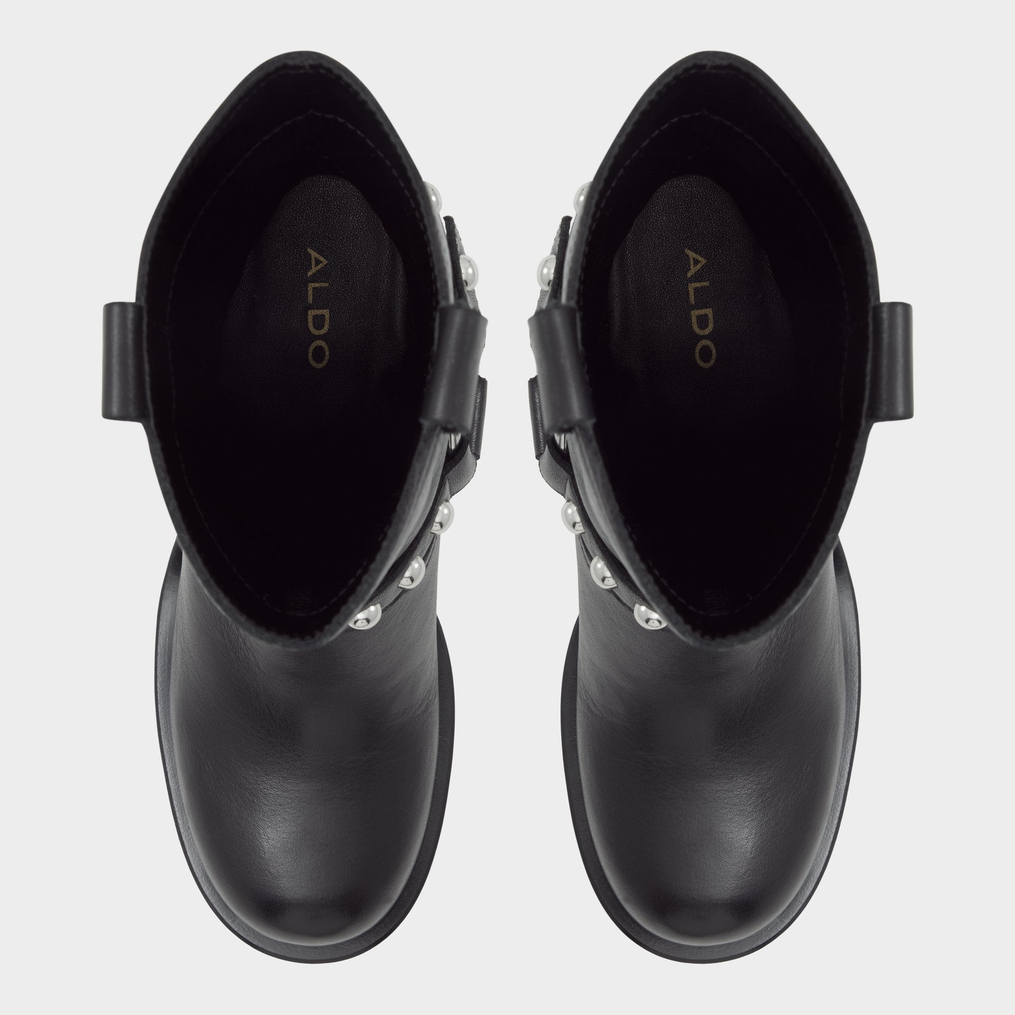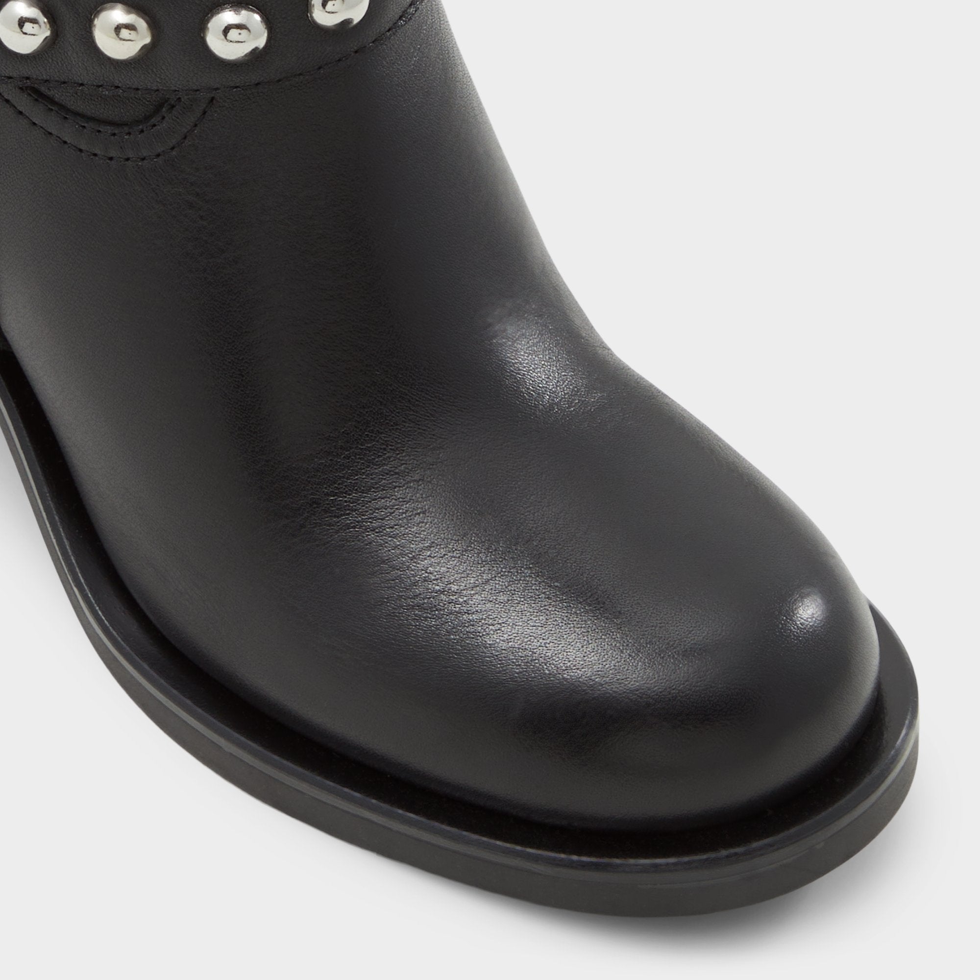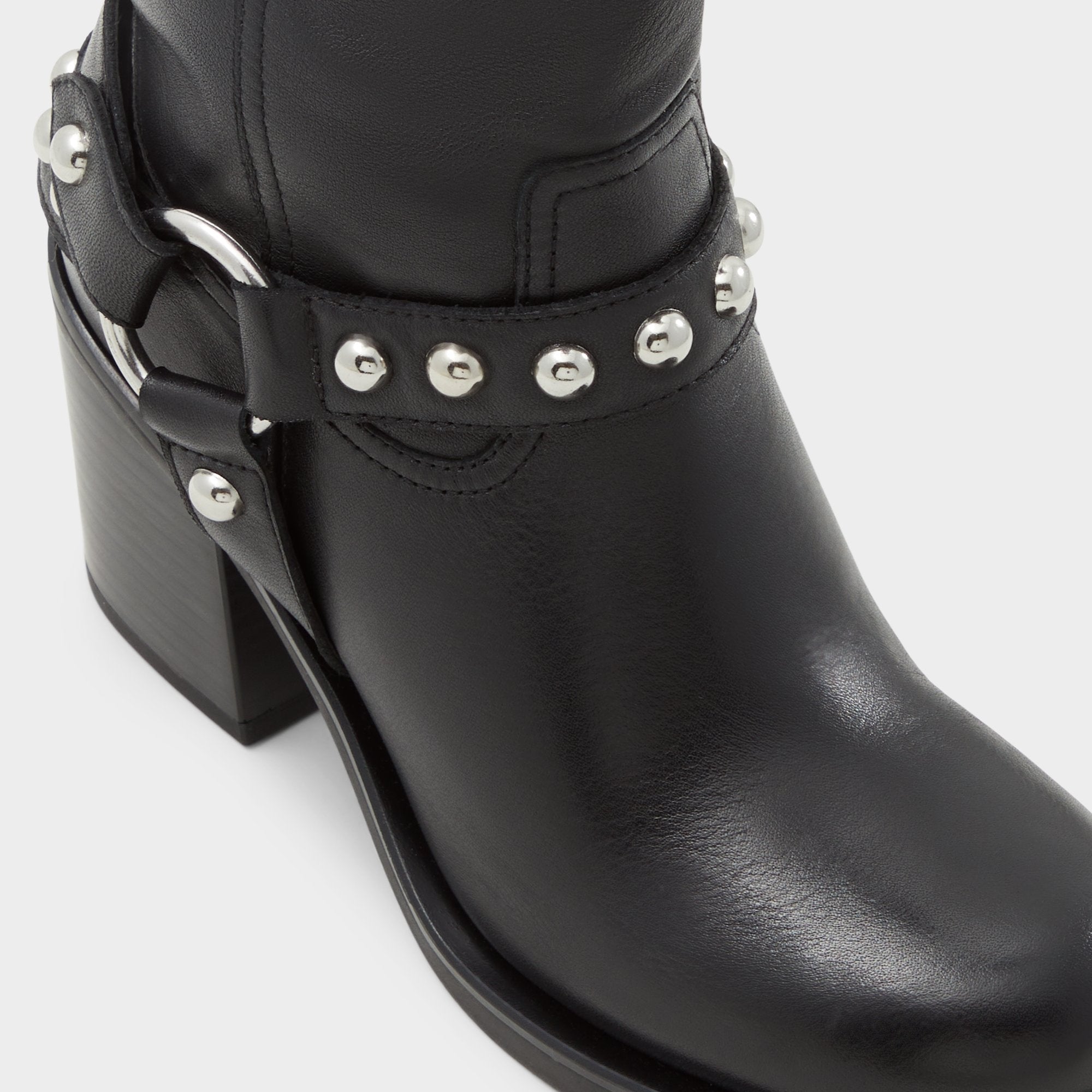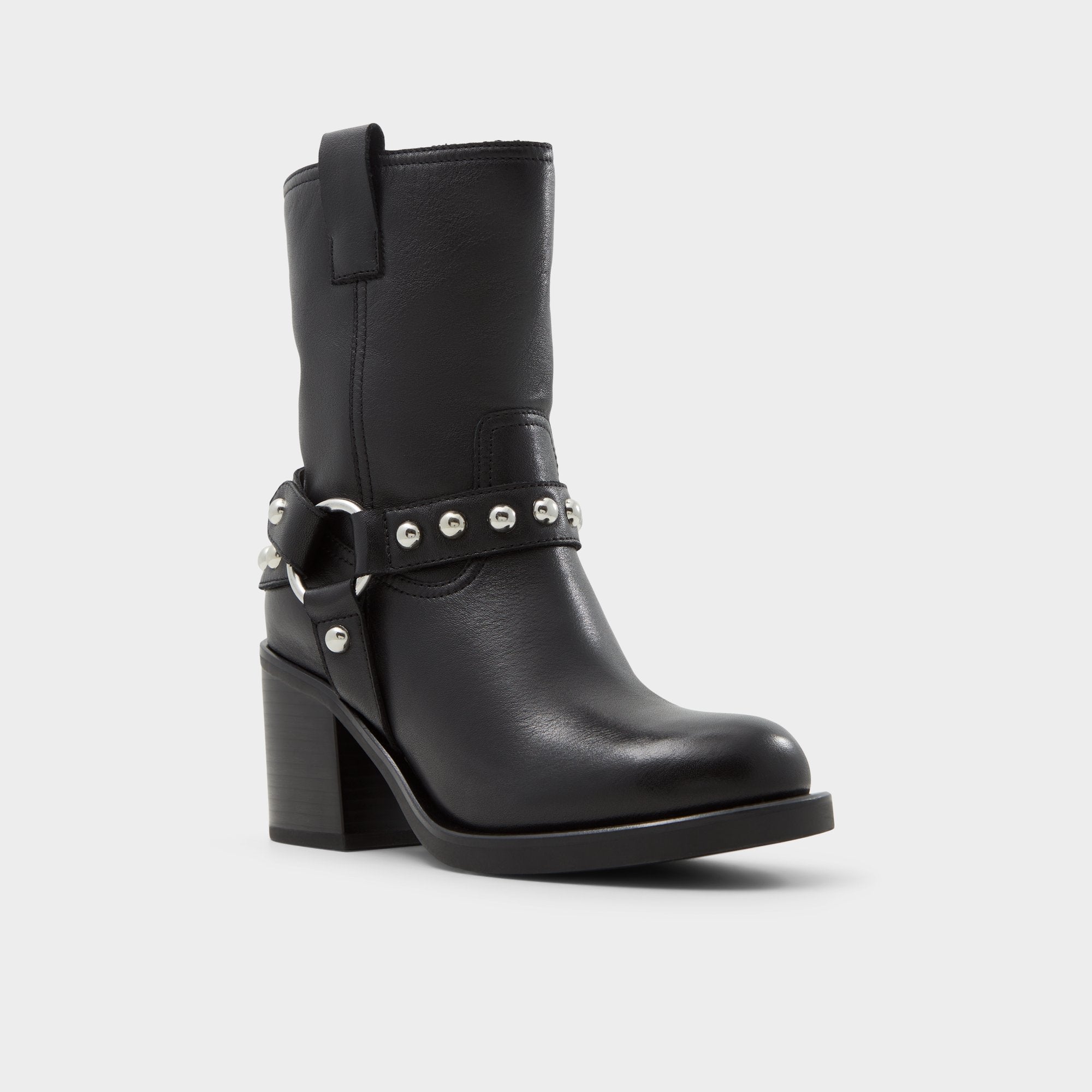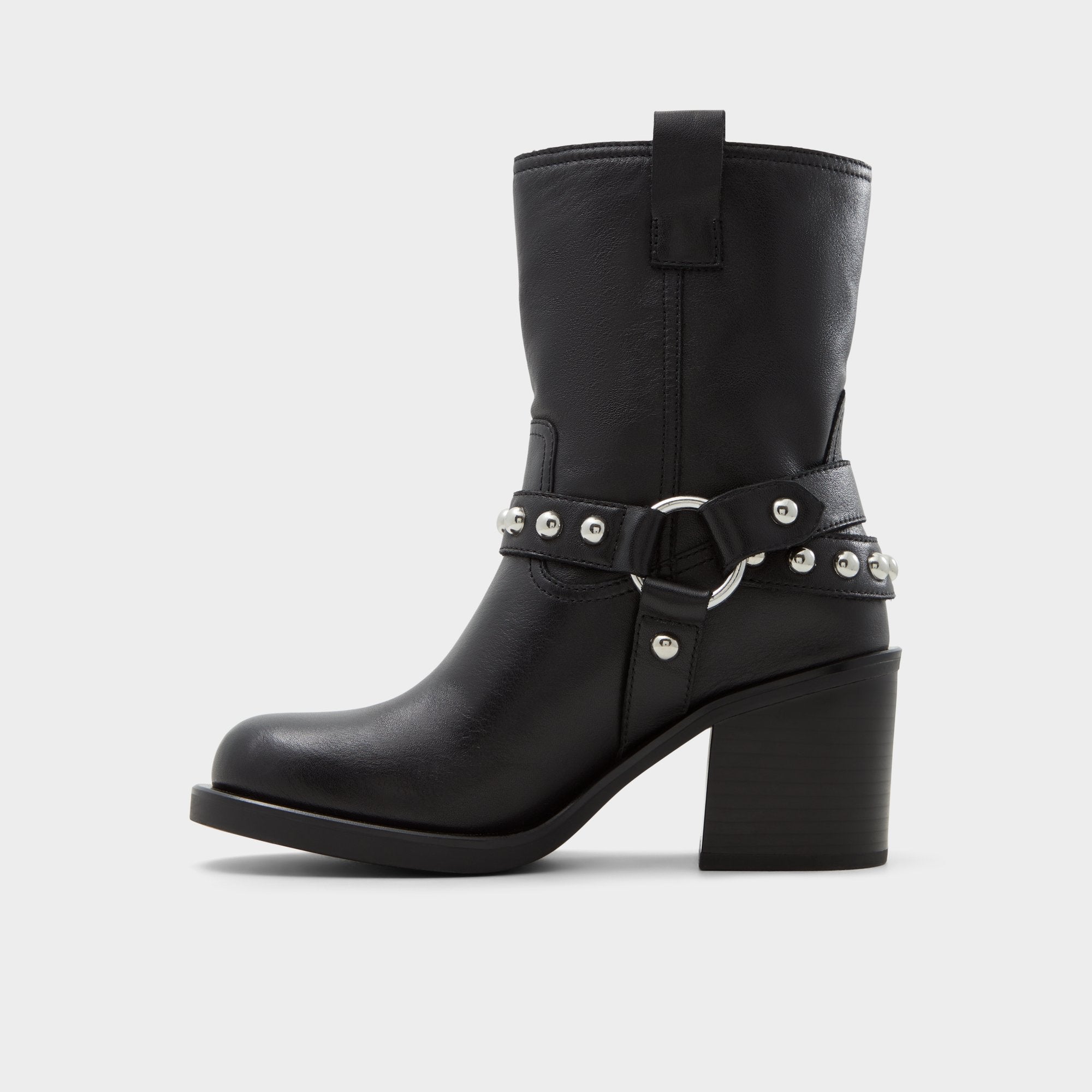 Harness and stud embellishments add that extra touch of cool to these need-now moto boots designed to complement all your ensembles.