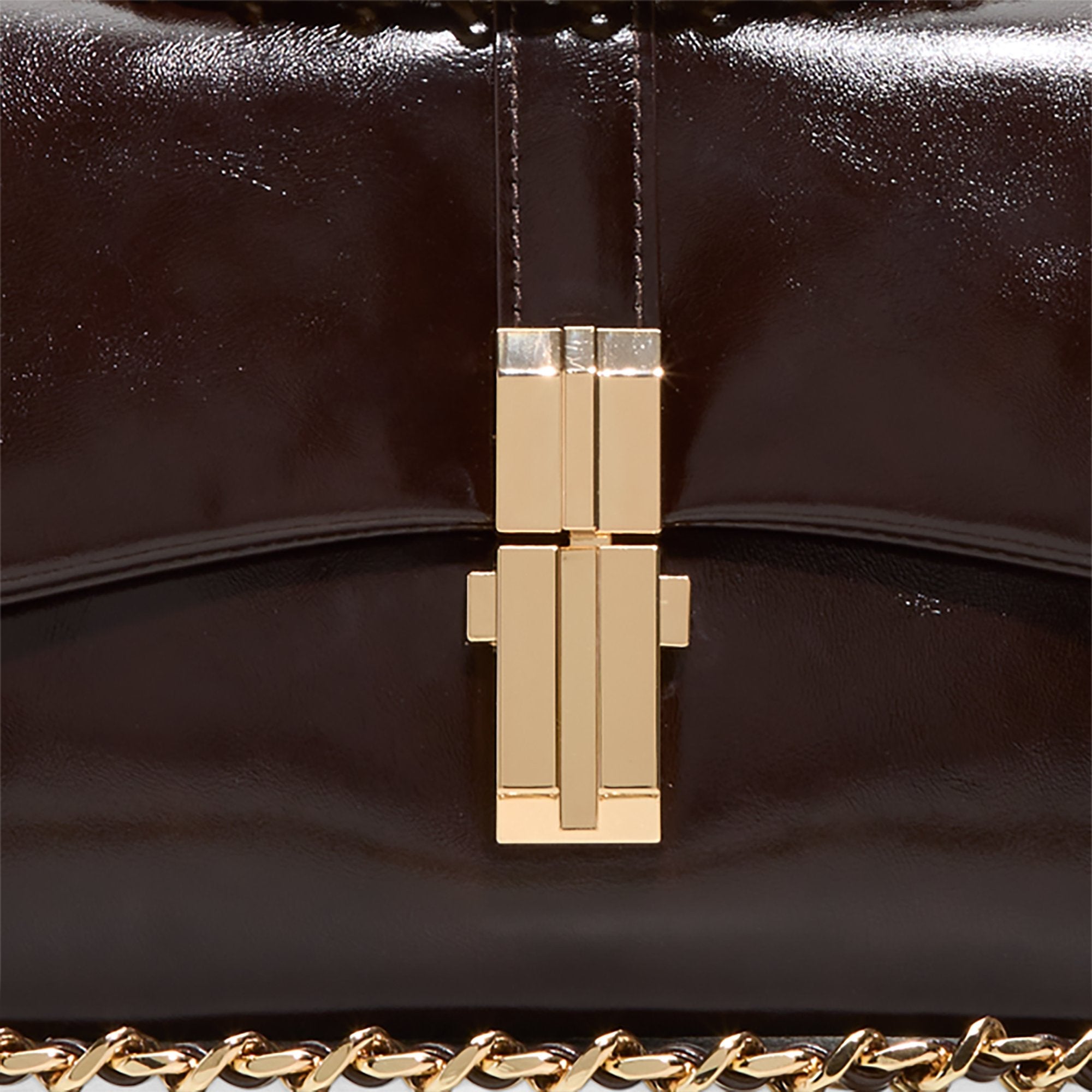 High-shine espresso patent frames a sculptural gold push-lock on this chain-strap evening bag. offering effortless after-dark polish with space for cards and keys. Tuck it under a satin blazer for rooftop dates or drape it over a little black jumpsuit at gallery nights.