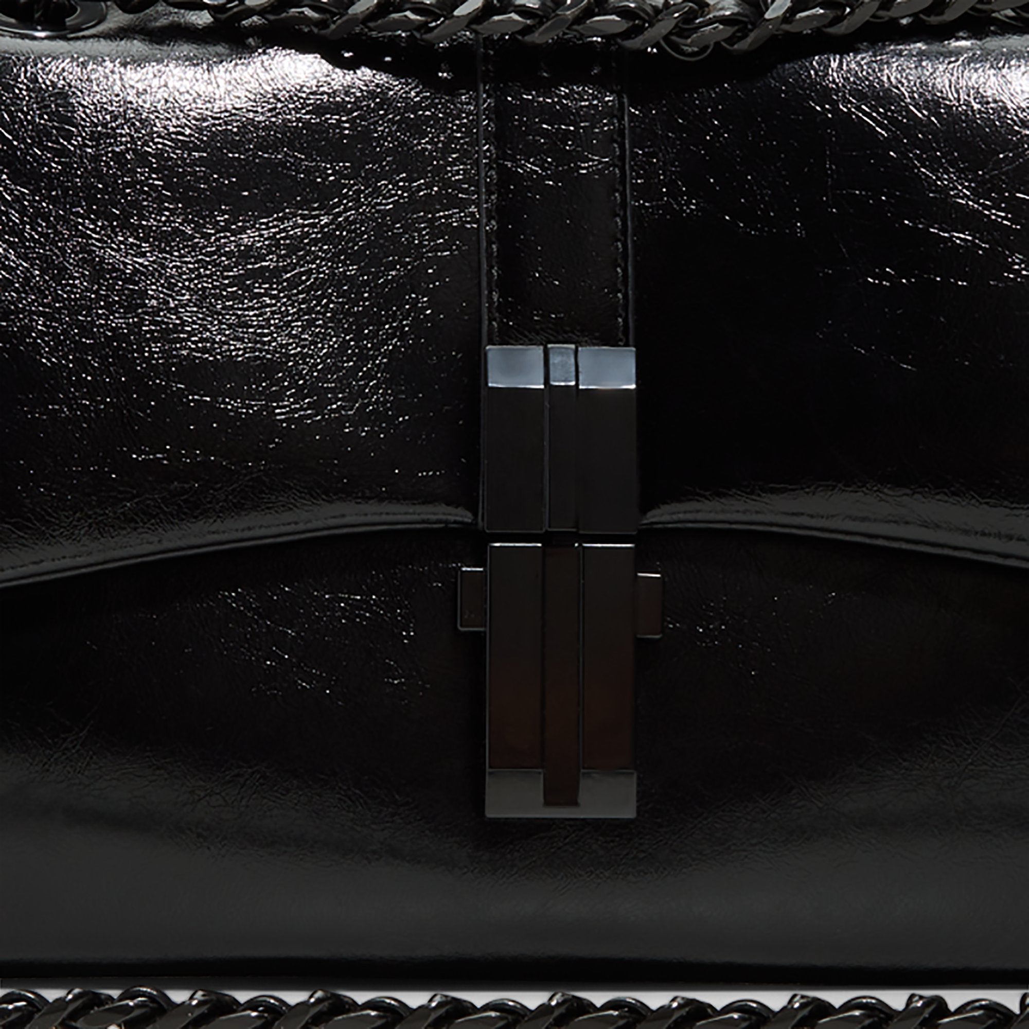 Midnight-gloss patent leather catches the city lights with a sculpted bar clasp anchoring a sleek compact flap. while a tonal chain strap keeps everything in line for after-hours confidence. and a whisper of refinement. Tuck it under a satin blazer for rooftop dates. or sling it cross-body with ripped denim for late-night gigs.