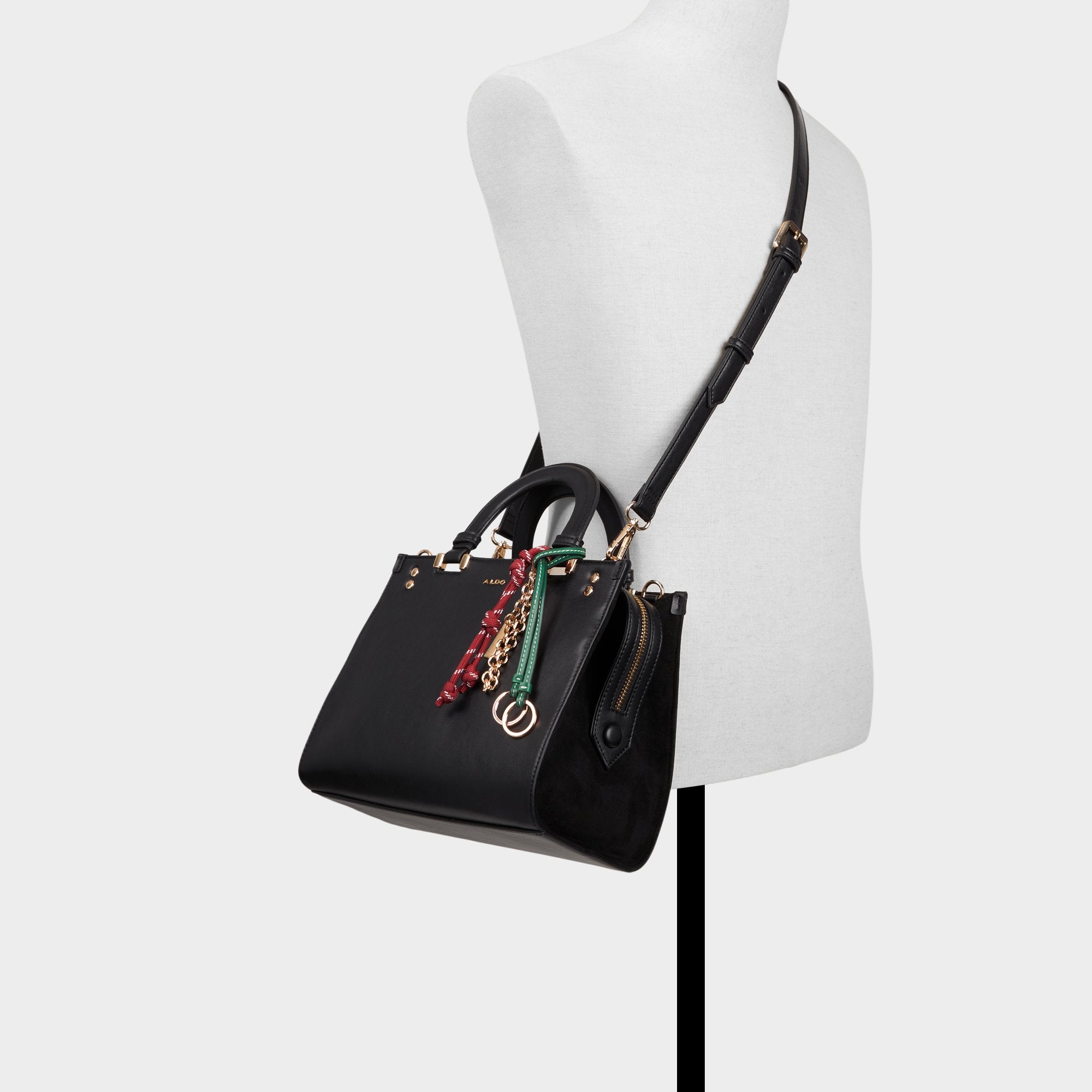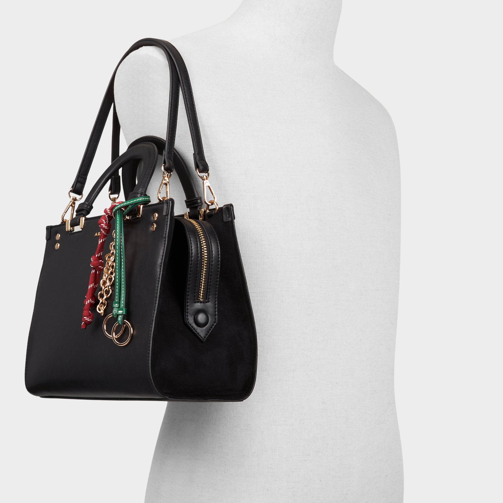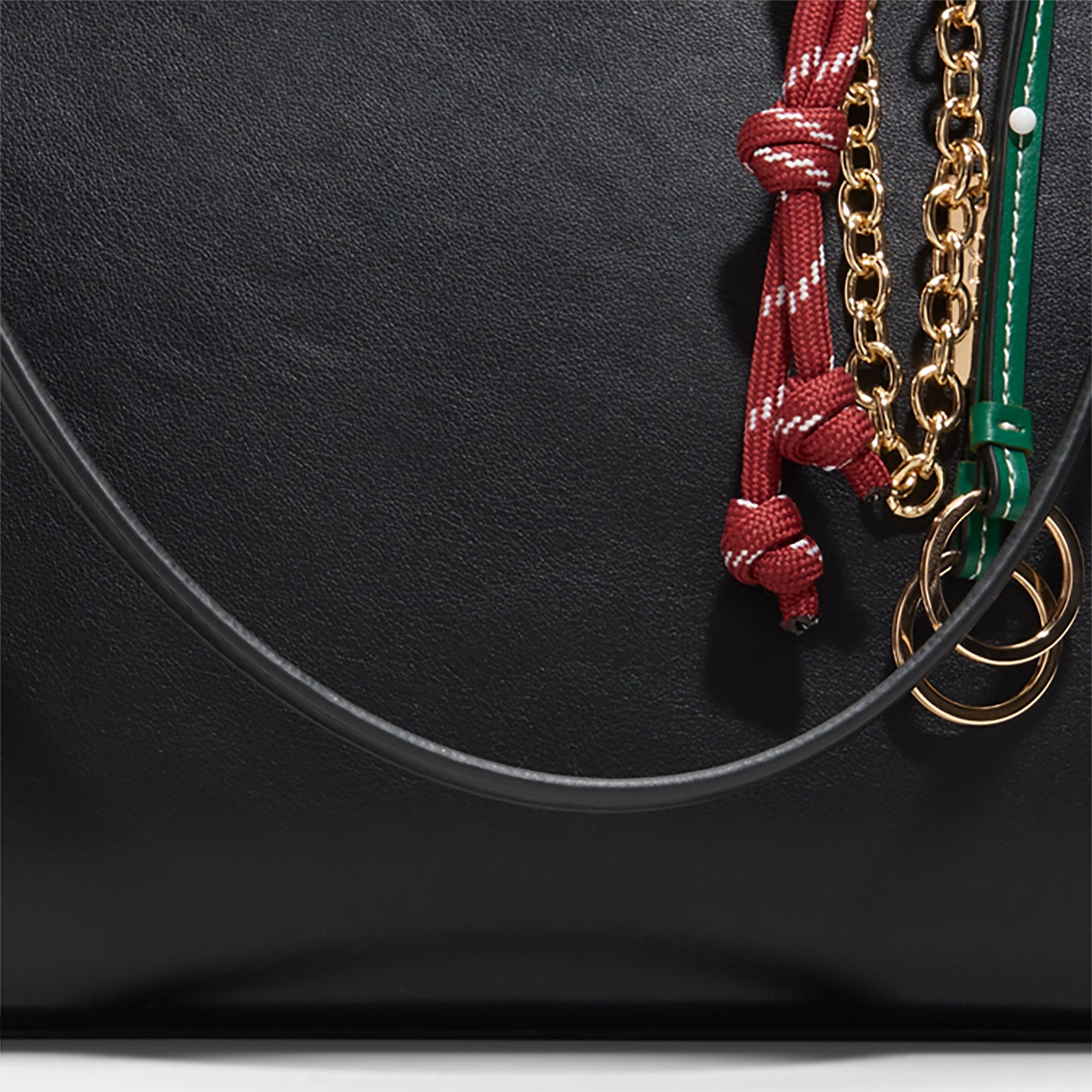 Sleek black leather frames a squared silhouette. with a knotted tassel-and-chain charm adding a bold focal point. while a convertible carry shifts from top-handle to cross-body with one easy snap. Carry it with tailored separates for coffee runs. or sling it over slip dresses on date nights. finishing looks with sleek confidence.