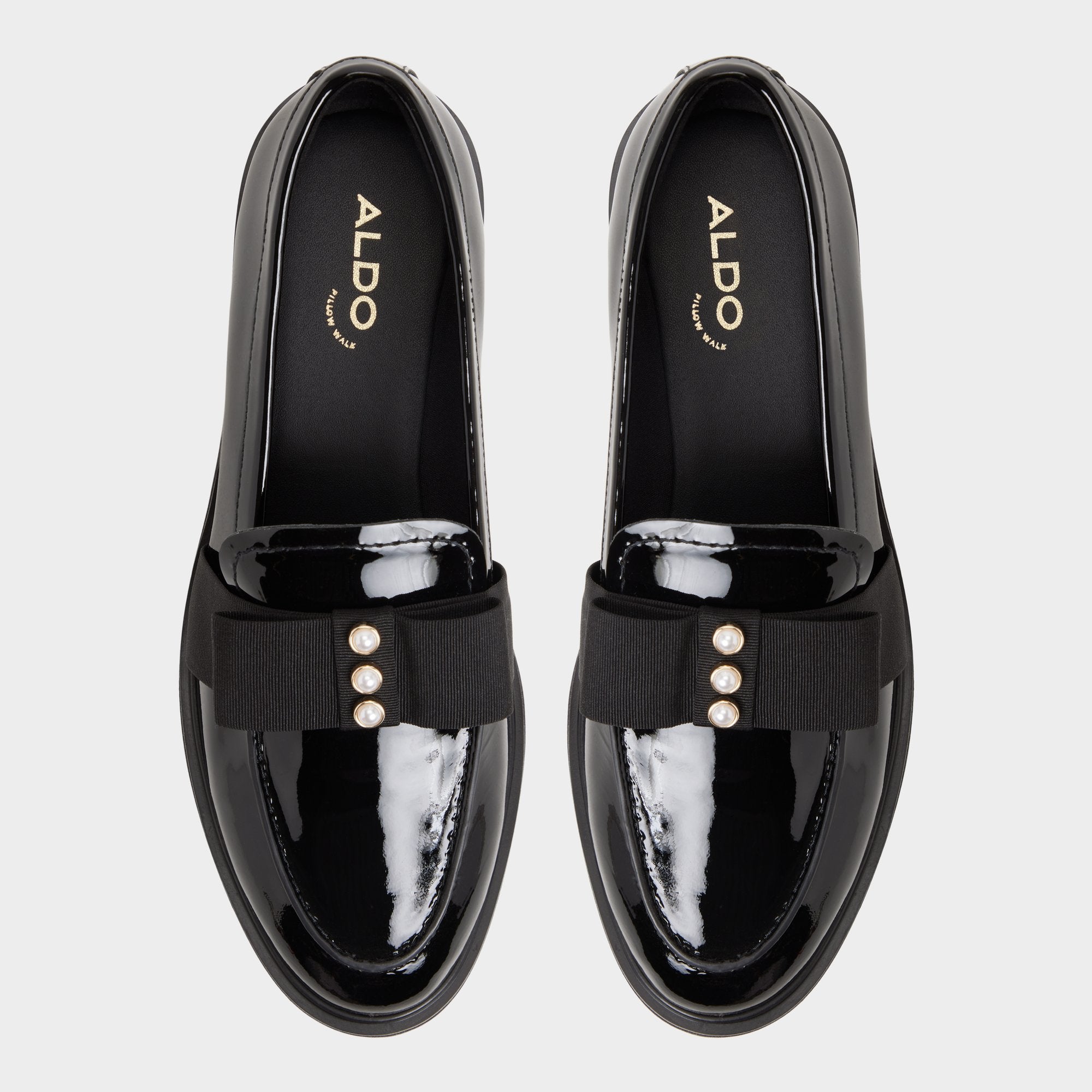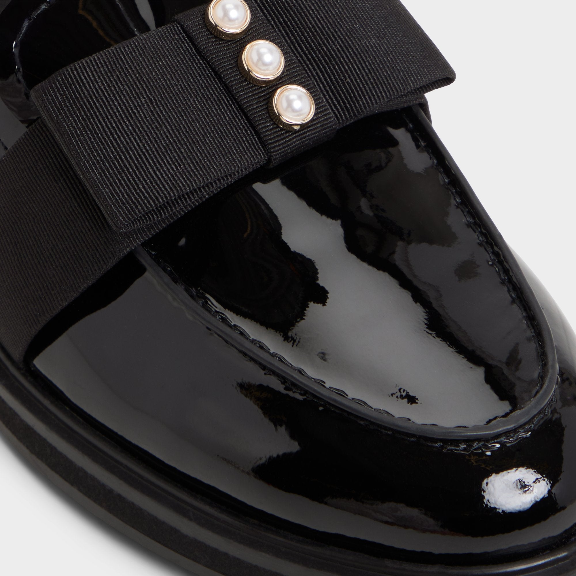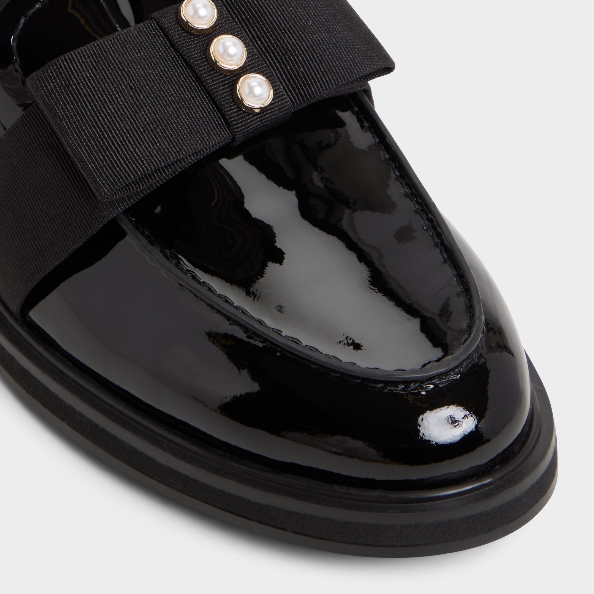 Midnight-gloss patent leather keeps this loafer looking freshly polished. while a wide grosgrain strap dotted with metal studs nods to rebellious charm. all riding a cushy rubber cup sole that makes city strides whisper. Pair with cropped trousers for power-lunch reviews. or ground a sequinned mini when late-night shows call for low-key shine.
