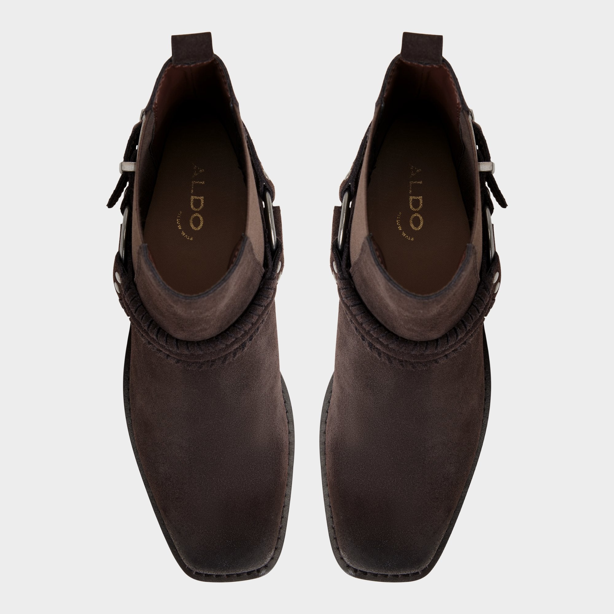 Velvety suede meets a low-slung block heel. but the western-inspired harness strap with burnished buckle. ring. and studs adds just enough attitude. turning everyday strides into confident showdowns down city blocks. Pair with relaxed denim for coffee runs or ground a floral mini when festival nights demand comfort that still keeps the spotlight.