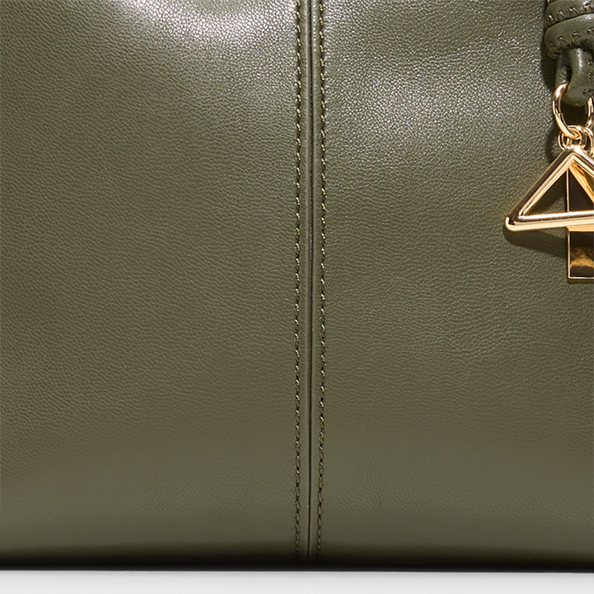 Smooth olive leather gives this structured tote an effortless city vibe. with knotted top handles. a geometric gold charm. and a hidden magnetic closure that keeps essentials tucked away. Pair it with wide-leg trousers for coffee meetings. or sling it over a slip dress at gallery nights to let the rich hue complete the look.