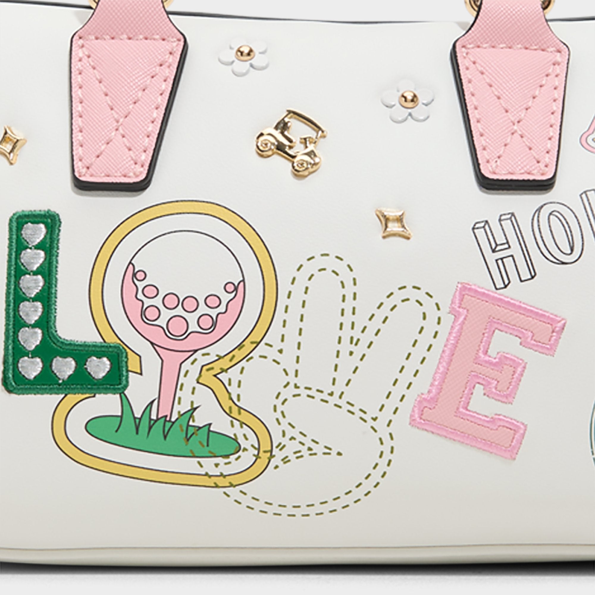 Candy-pink handles and playful doodles stitch weekend energy into this leather barrel. while a detachable web strap morphs from grab-and-go top-handle to laid-back cross-body in seconds. so cafe runs feel effortless and weekend escapes sparkle. Pair it with a sundress for sunny cafe dates or clip on the long strap with joggers for travel days to finish the vibe.