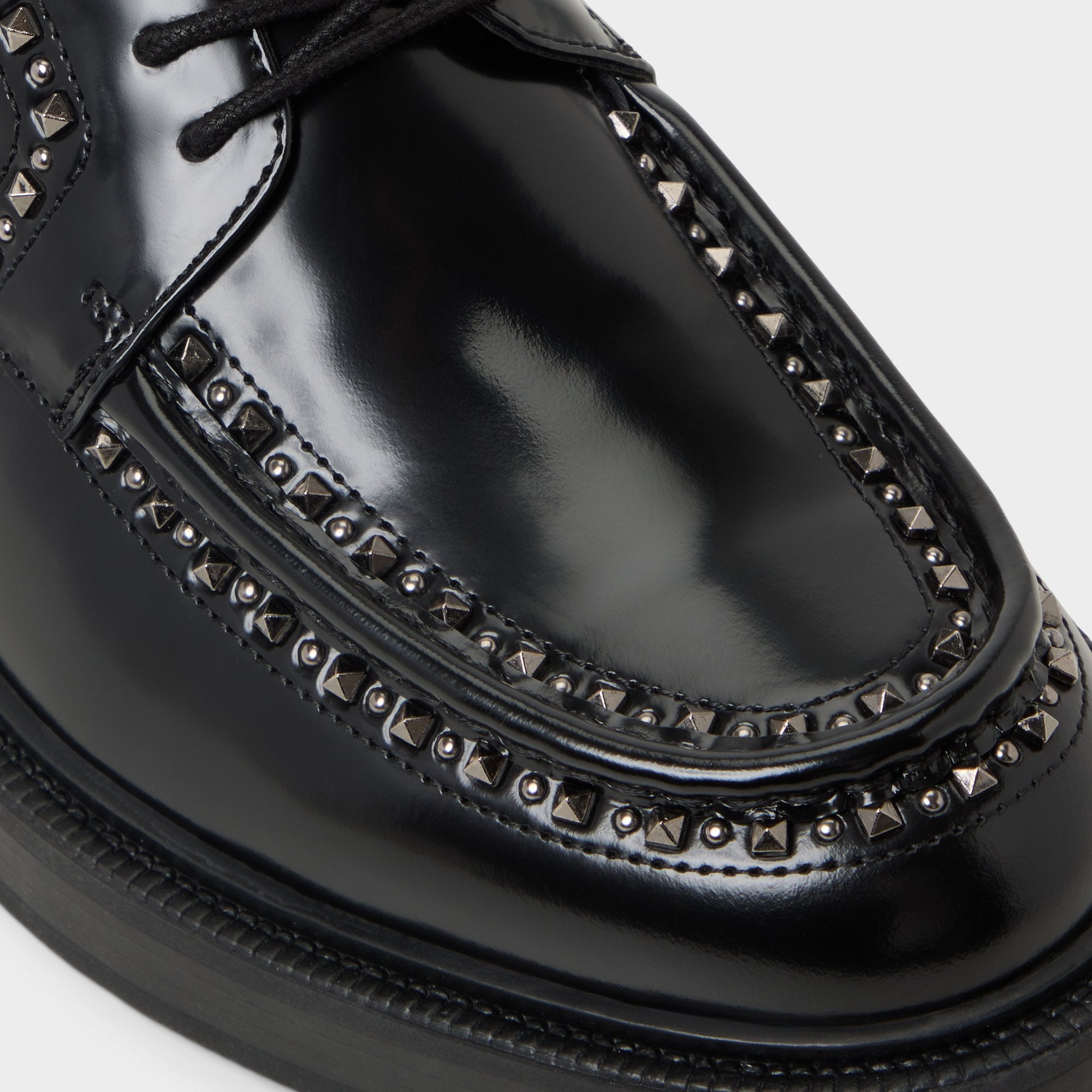 Glossy patent leather pairs with metal studs on this derby. and a flexible welt keeps every stride smooth from after-dark to late-night errands through long client meetings and city hops. Pair it with charcoal tailoring for mixers. or roll with black denim and a leather jacket for after-hours gigs.