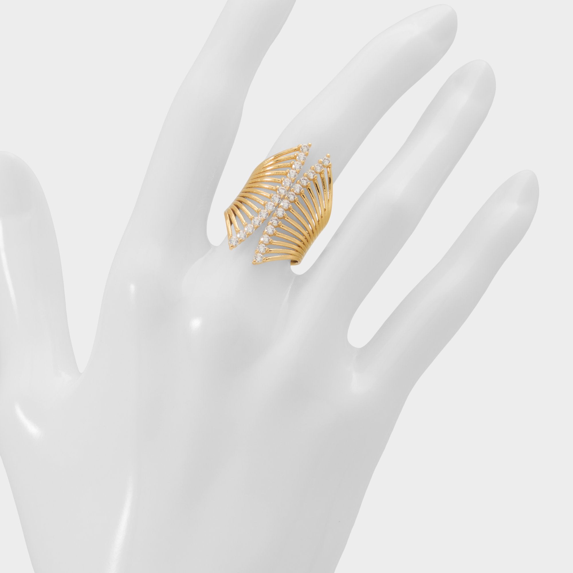 Fanned gold-plated strands spread across the finger like glittering wings two rows of cubic zirconia running down the center providing arena-level sparkle all day. Stack it beside slim bands at rooftop parties or let it solo with satin slips at weddings finishing either look brightly.