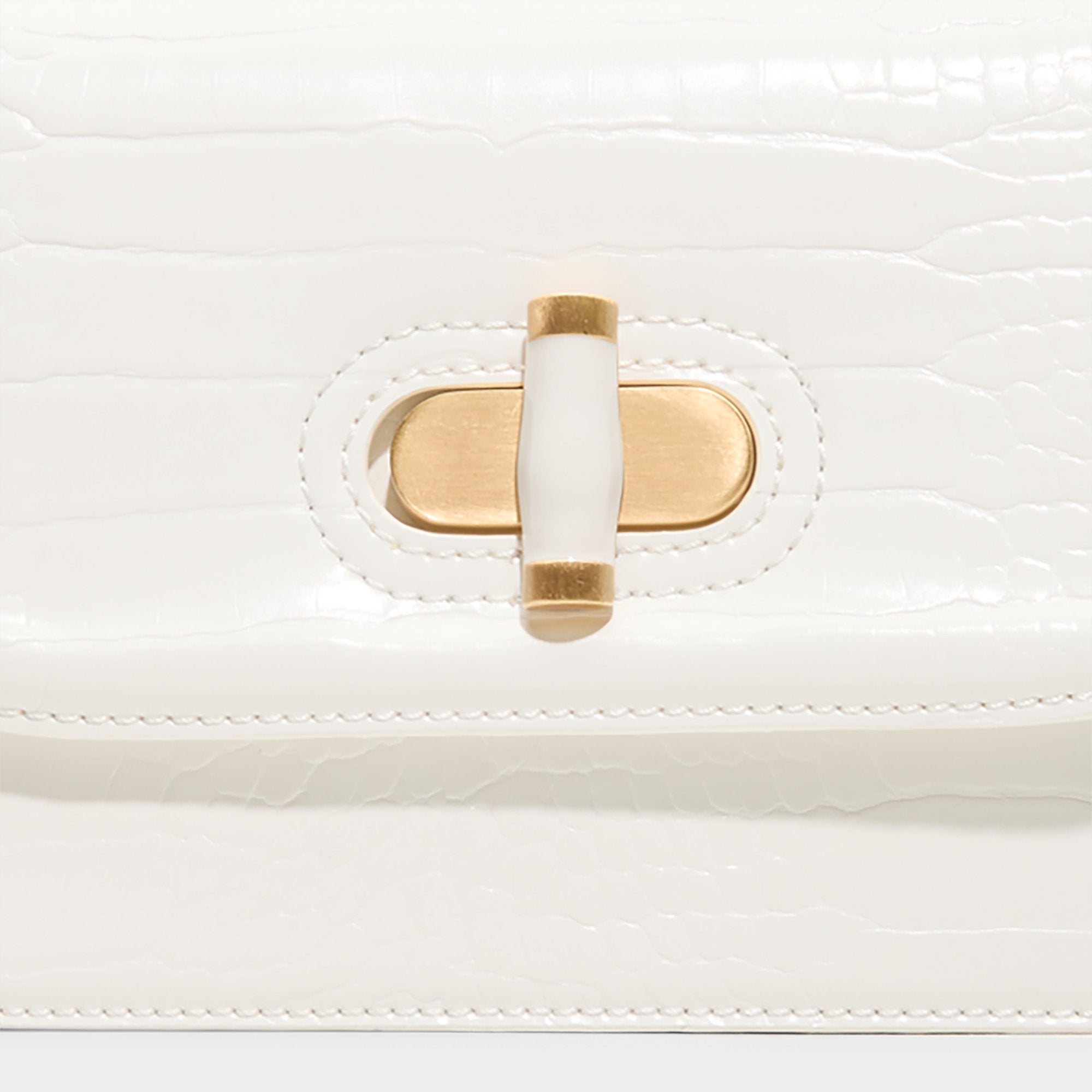 Crisp croc-embossed leather catches the eye as a chunky bamboo top handle steals the scene. finished with a turn-lock that hints at quiet luxury and everyday city polish. Carry it with tailored linen for office catch-ups. or tuck it under your arm with a sundress and sandals at cafe dates.