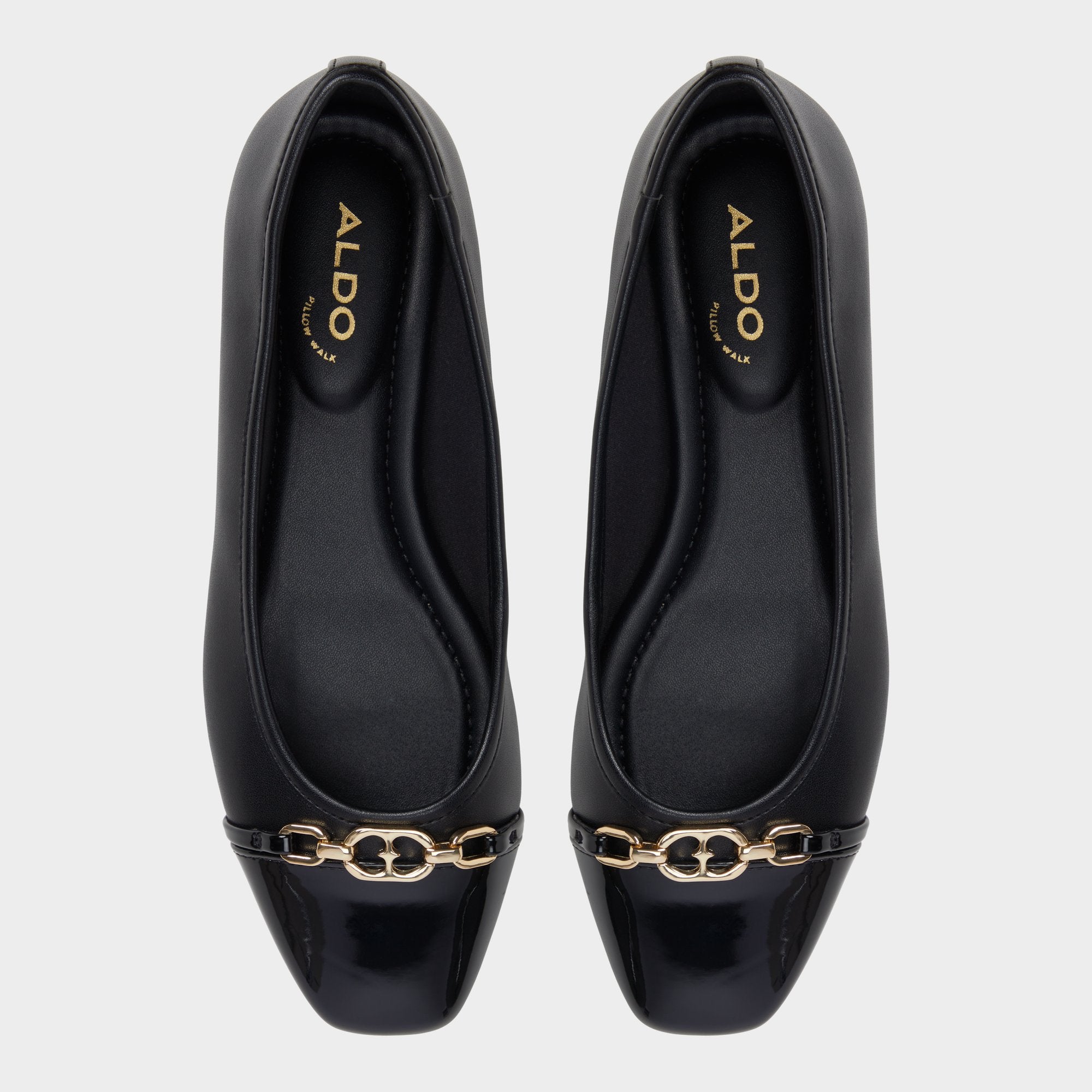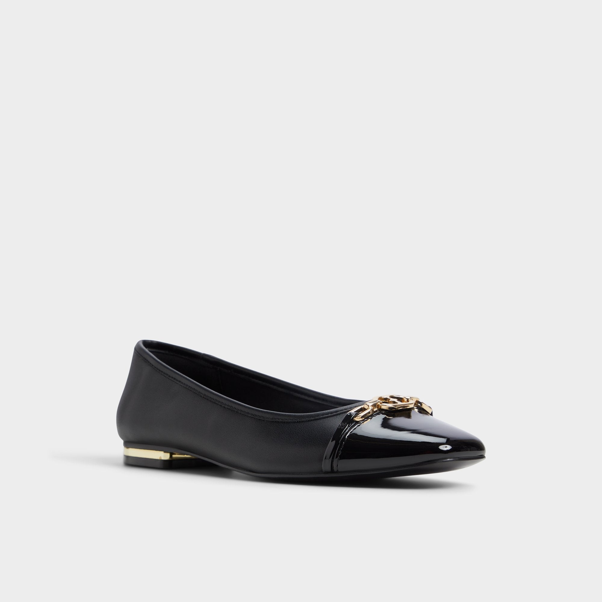 The glossy patent cap toe adorned with a delicate gold chain refines this leather ballet flat. while metal at the heel adds polish and confidence from morning brainstorms to moonlit meet-ups. Pair with cropped trousers for desk days. or swap in a satin slip skirt when gallery cocktails call.