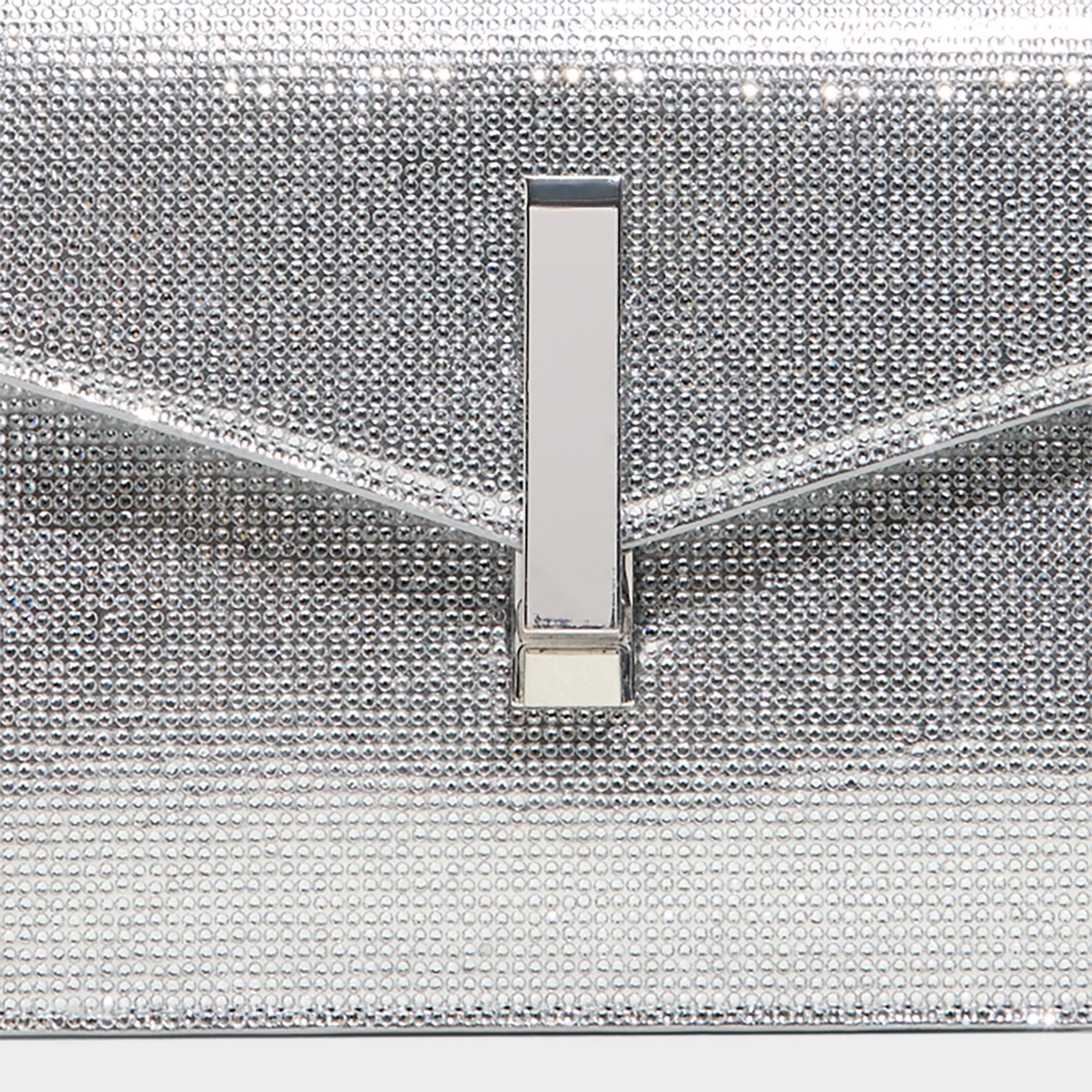 Liquid-silver mesh wraps this envelope clutch in head-turning shimmer. secured by a sleek vertical bar clasp that snaps shut to keep everything tucked safely when the lights go low. Clutch it with velvet slips at rooftop parties or tuck it under tailored blazers at after-work drinks to polish every move.