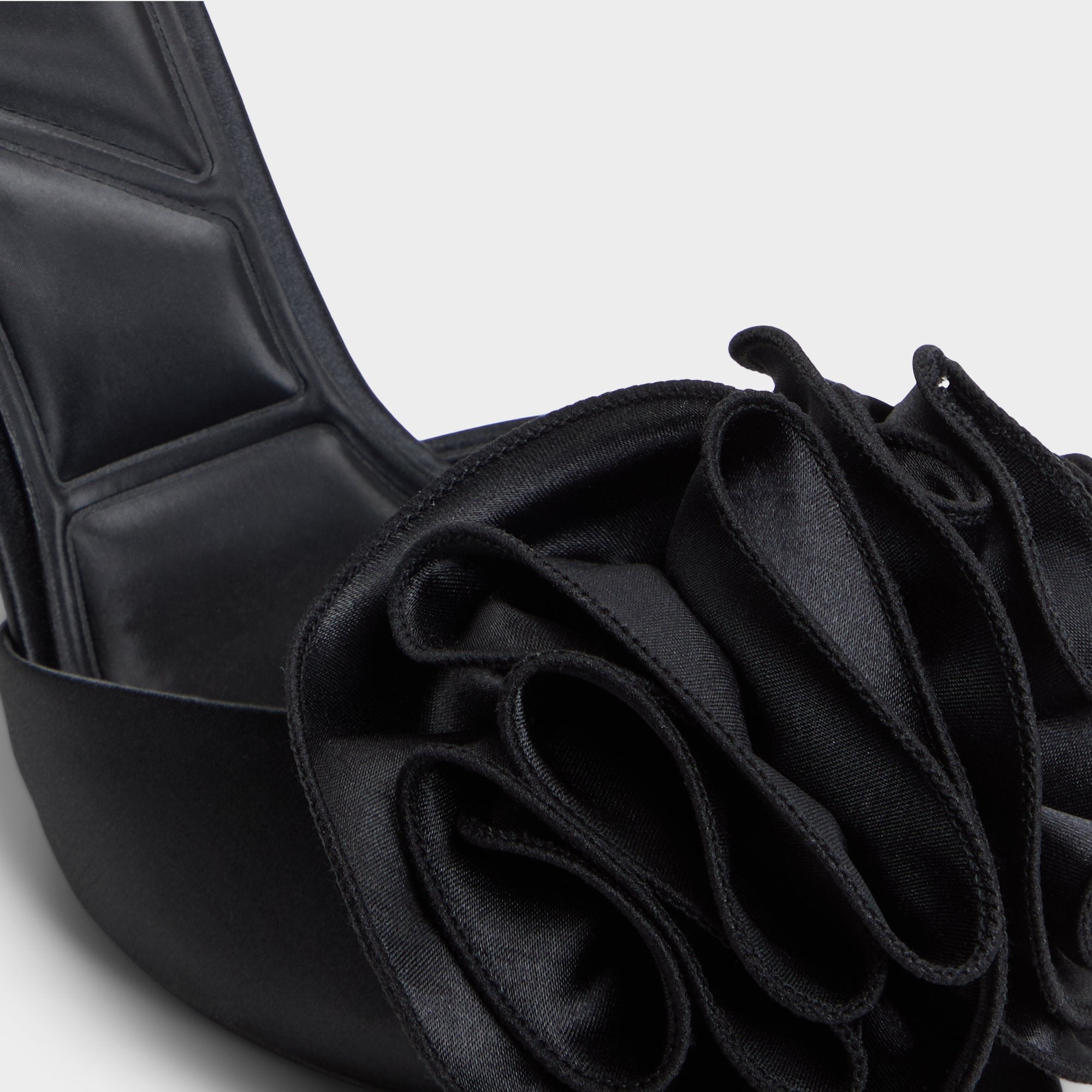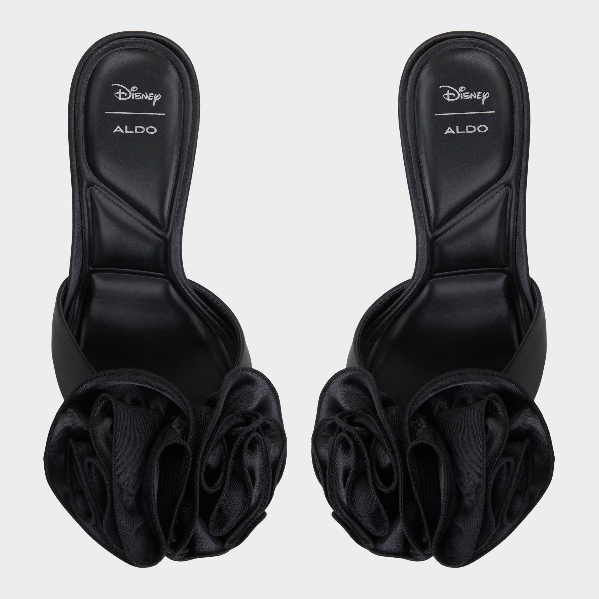 Just like Maleficent. this shoe reveals the duality of delicate femininity and dark impulses. Wear this black satin mule topped with a floral embellishment to bring a mix of bold and elegant. A dramatic style destined to rule the night.