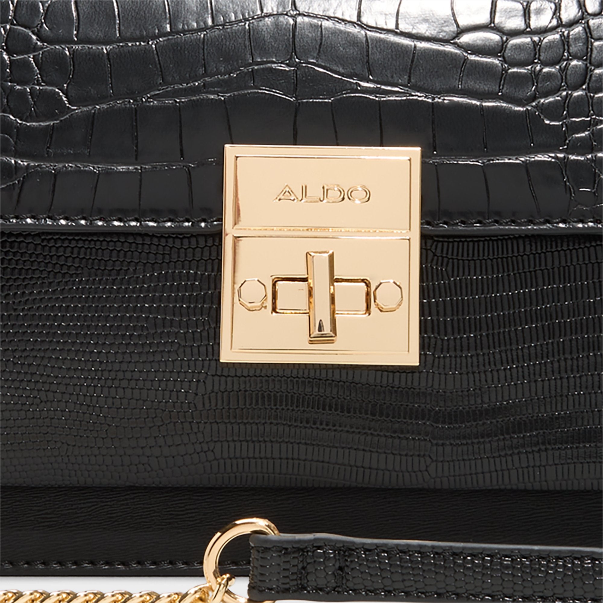 Glossy croc-embossed leather pairs with matte canvas panels on this structured mini. featuring a polished twist-lock and removable chain strap that shifts it from sophisticated to cross-body ease. Carry with a blazer and wide-leg trousers for boardroom poise. or sling over slip dress nights to complete the look.