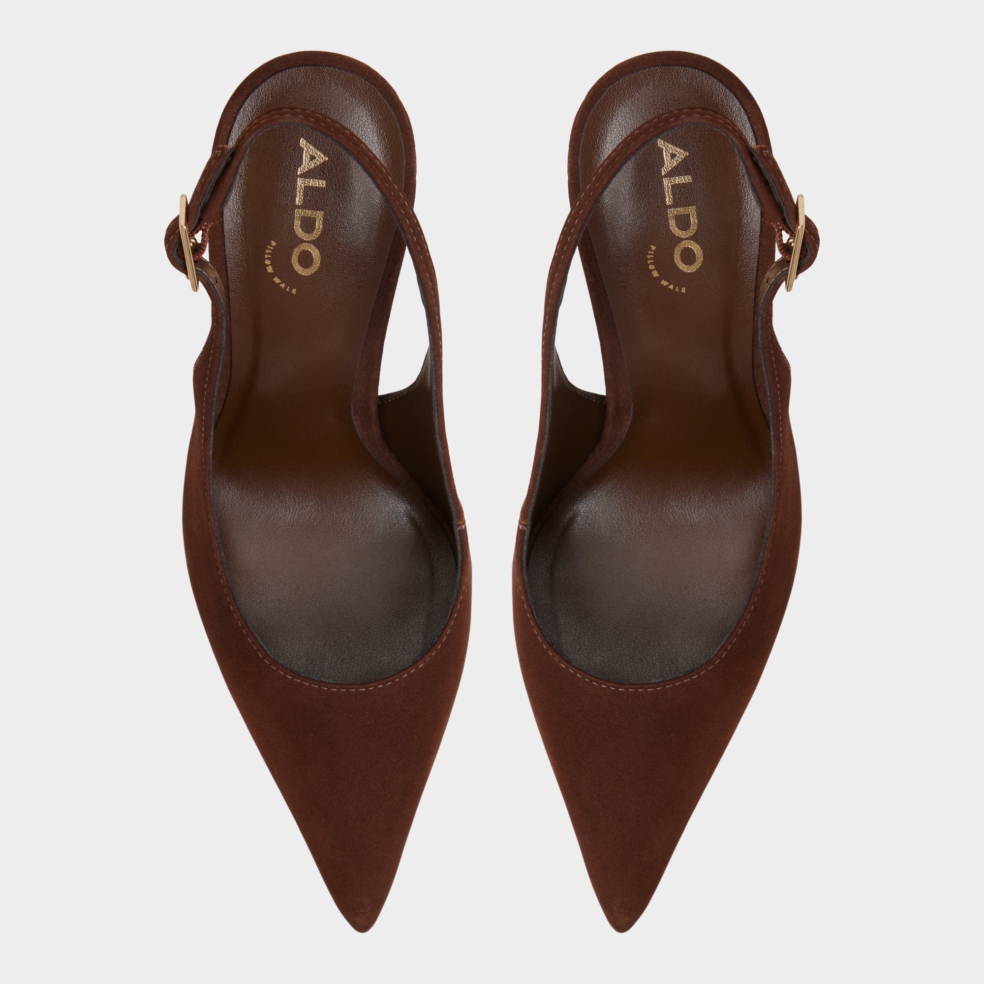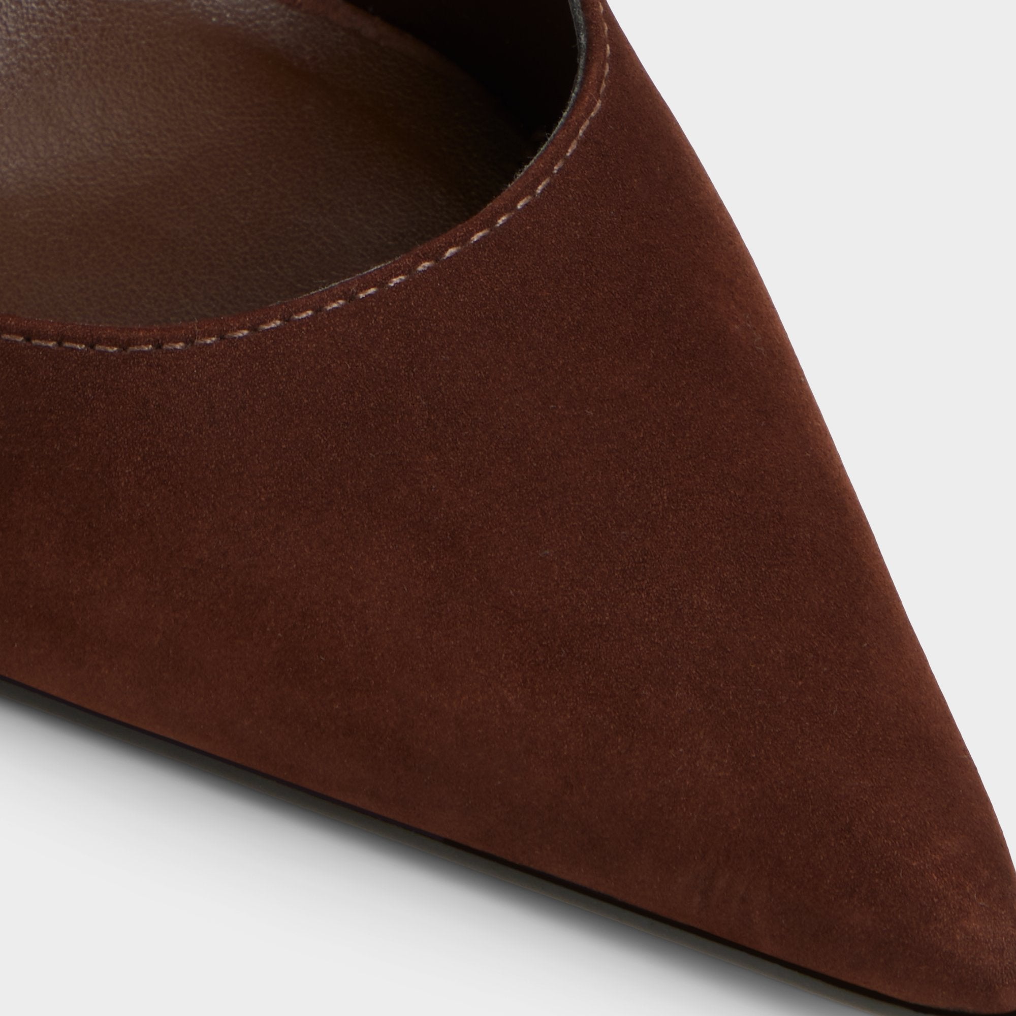 Cocoa suede cloaks sleek slingbacks. crowned by a pin-sharp stiletto that sharpens the silhouette and boosts confidence with every step. catching light with a whisper of luxury. Pair with tailored trousers for pitches. or swap in a satin midi as gallery nights drift into cocktails.