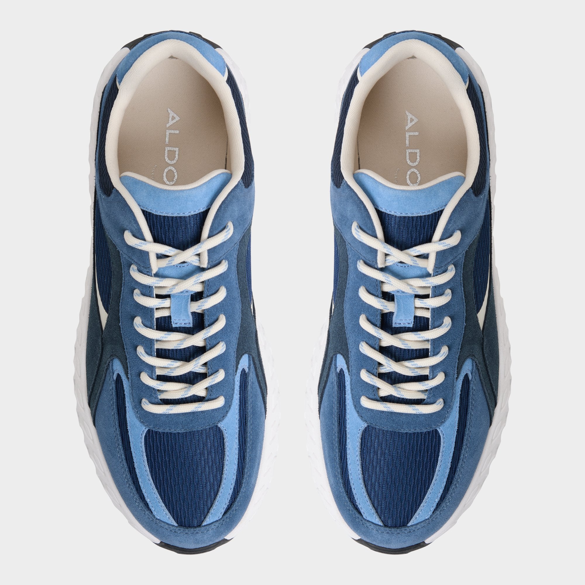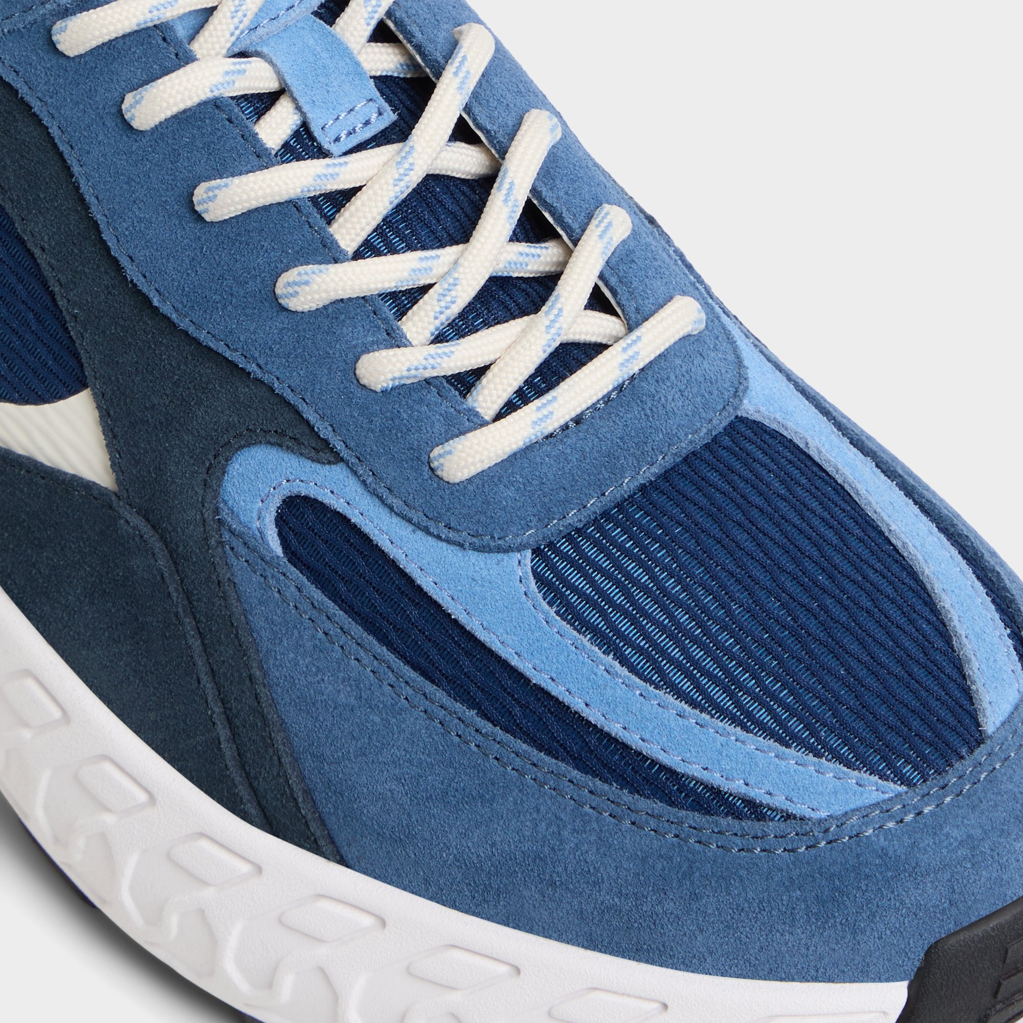Wave-like sculpting along oversized jogger soles gives this blue suede mesh sneaker a bold silhouette. while airy cushioning keeps everyday steps steady for long days and breezy city strolls. Pair it with tapered denim for coffee runs. or roll with linen shorts for weekend getaways.