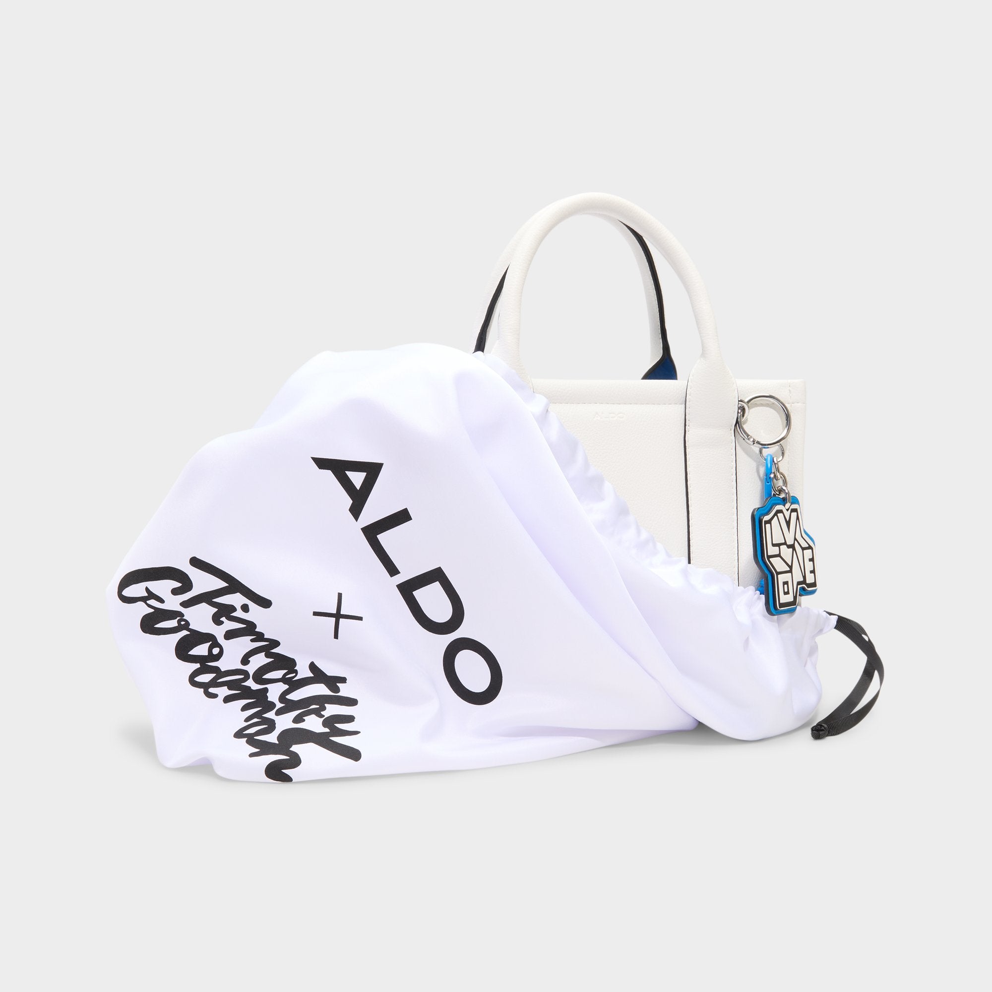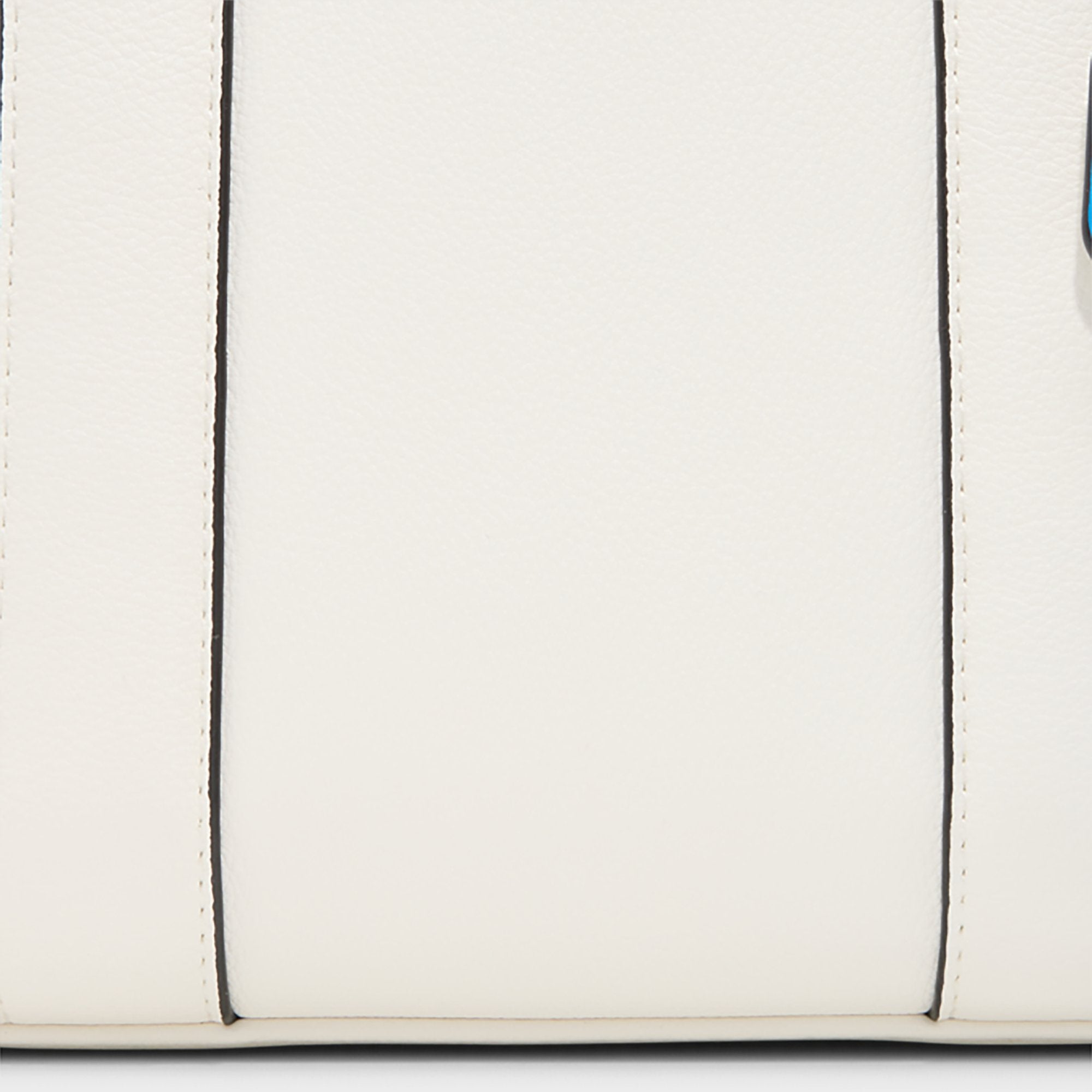 Clean-cut white leather with racer-black piping gives this mini tote modern edge. while a clip-off electric-blue paracord charm adds a playful pop to the open-top silhouette that’s made for quick grabs on the move. Carry it with an oversized linen blazer for coffee meetings or tuck next to denim cut-offs for festival days. finishing looks with crisp confidence.